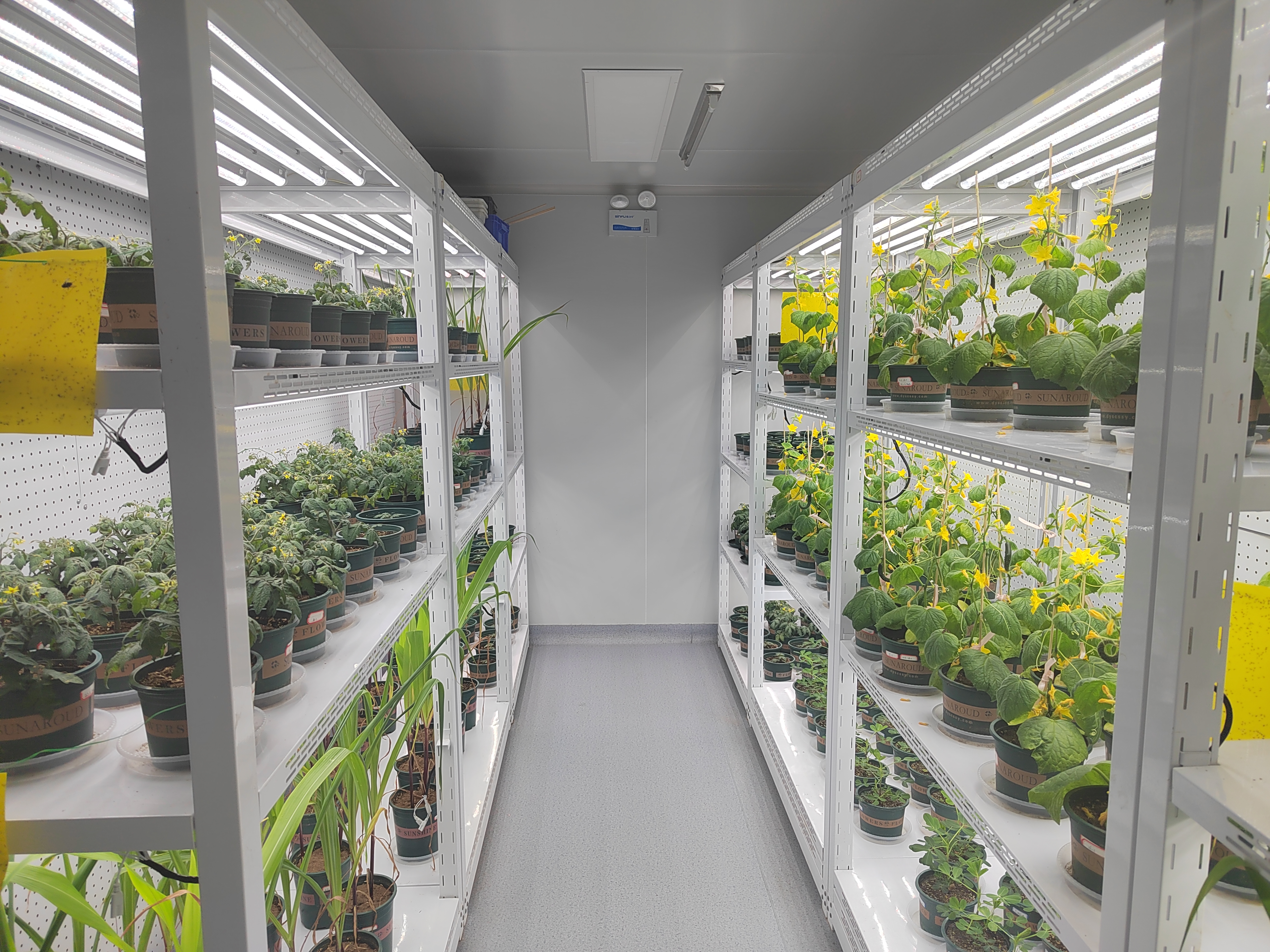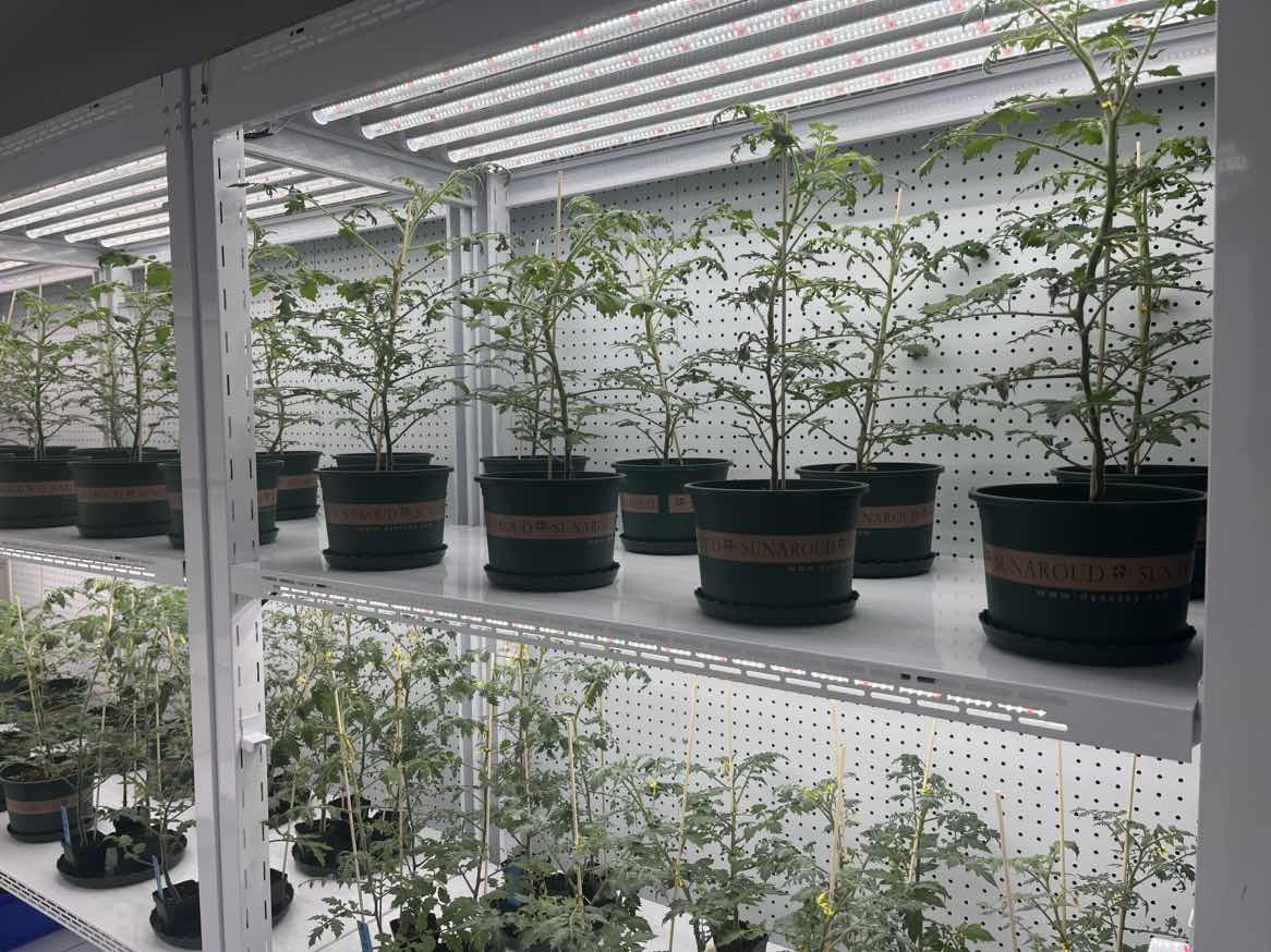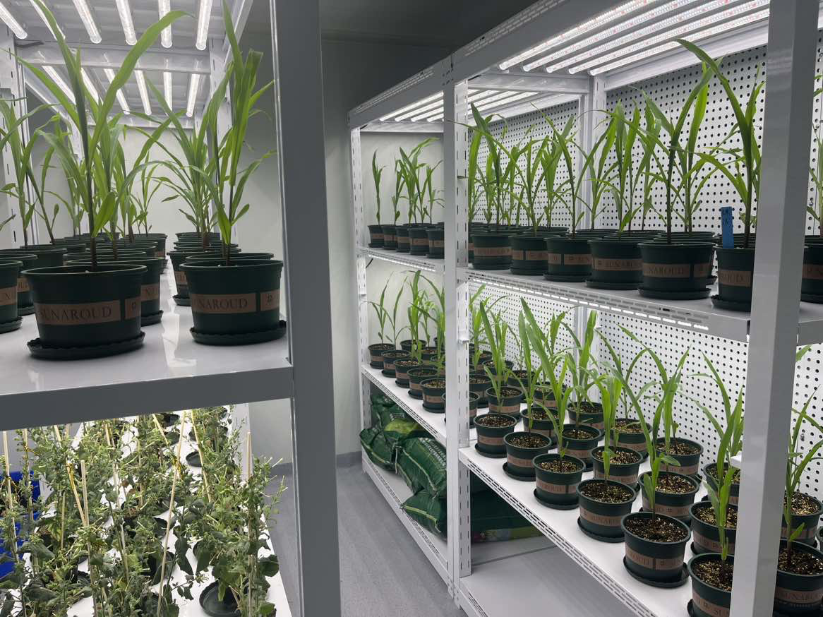 人工智能气候室的建立是为了更好地消除从原料到产品形成全过程可能存在的安全性隐患和更好更快地验证产品的效果性。气候室共有三间,实验室面积35.3平方米,标准型植物栽培生长架20套。配备独立新风系统,配合全自动光温调控平台,实现24小时不间断对室内光照强度、光周期,空气的温度、湿度、CO2浓度的全面监控和有效控制。可设置4-40℃温度环境,可以模拟作物在低温、适温、高温环境下以及干旱胁迫、盐胁迫等逆境条件下的生长情况。